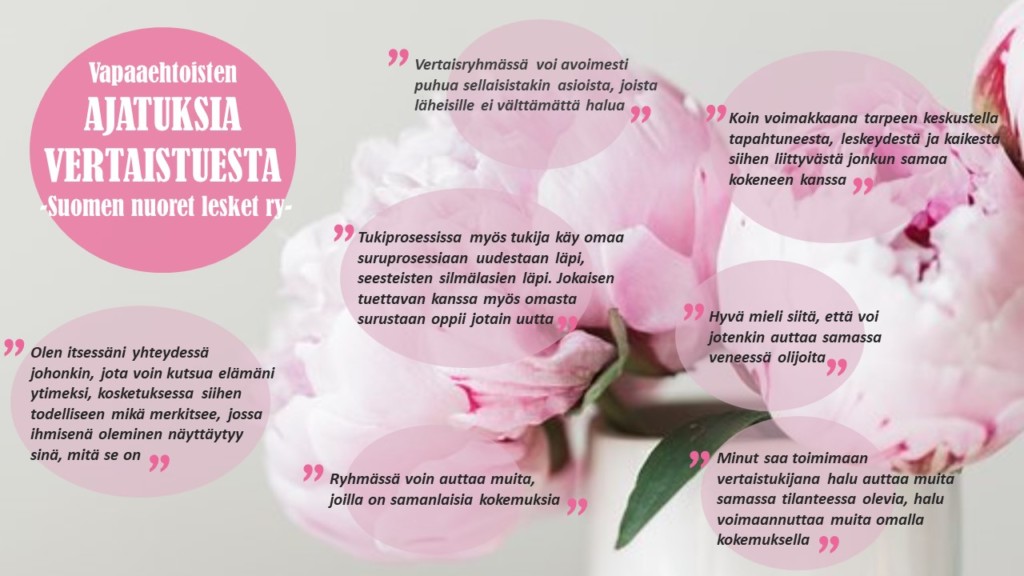 Lämmin kiitos teille kaikille Suomen nuoret lesket ry:n vapaaehtoisille ja vielä erityiskiitos teille, jotka jaoitte ajatuksianne vertaistukeen liittyen. Yhdessä olemme enemmän!