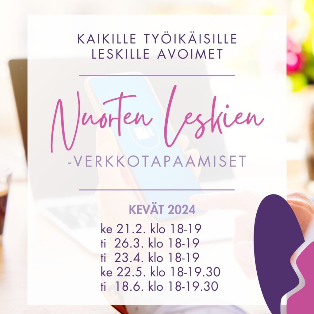 Tule tapaamaan muita leskiä kerran kuussa järjestettäviin avoimiin verkkotapaamisiin Zoomissa! Tapaamisessa saat mahdollisuuden tulla keskustelemaan ja jakamaan ajatuksia saman kokeneiden kanssa. Voit osallistua omalla tavallasi, puhua ja jakaa asioita sen verran kuin itse koet sopivaksi.