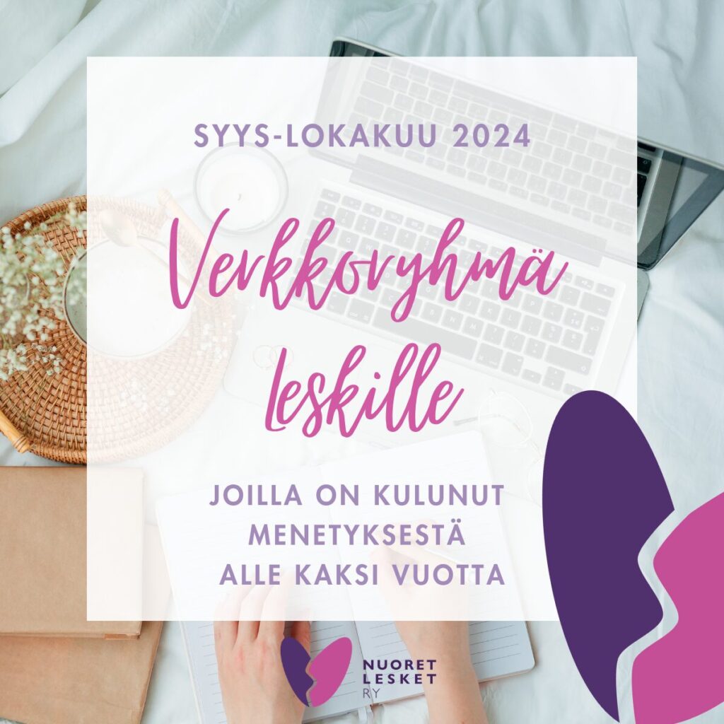 Järjestämme syys-lokakuussa 2024 kuuden kerran pituisen verkkovertaisryhmän työikäisille leskille, joilla leskeytymisestä on aikaa korkeintaan kaksi vuotta. Ryhmä on suljettu eli osallistujat ovat joka kerralla samoja, ryhmän käynnistyttyä mukaan ei oteta uusia osallistujia. Verkkovertaisryhmään osallistuminen tapahtuu Zoom-videoyhteyden kautta. Ryhmään osallistuminen on maksutonta.
