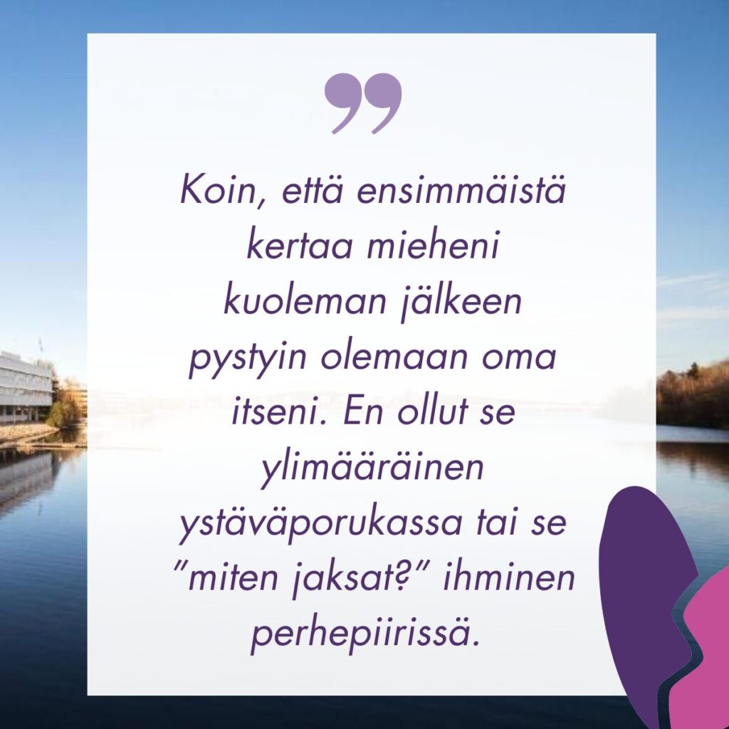 Ja viimeistään aamulla epäilyt hälvenivät, kun pääsimme alkamaan. Tunnelma oli heti hyvin tiivis, mutta lämminhenkinen ja tuntui, että olisimme tunteneet jo pidempään. Herkistyimme kuuntelemaan toistemme tarinoita ja vaikka tarinat olivat erilaisia, niin kaikkia meitä yhdisti tuo valtava menetys ja tuska, mikä puolison kuolemasta oli seurannut. Koin, että ensimmäistä kertaa mieheni kuoleman jälkeen pystyin olemaan oma itseni. En ollut se ylimääräinen ystäväporukassa tai se ”miten jaksat?” ihminen perhepiirissä. Minun ei tarvinnut kannatella kenenkään surua tai kukaan ei tarkkaillut koko ajan, miten minä voin. Oli helpottavaa vaan olla ja antautua hyvien keskusteluiden äärelle.