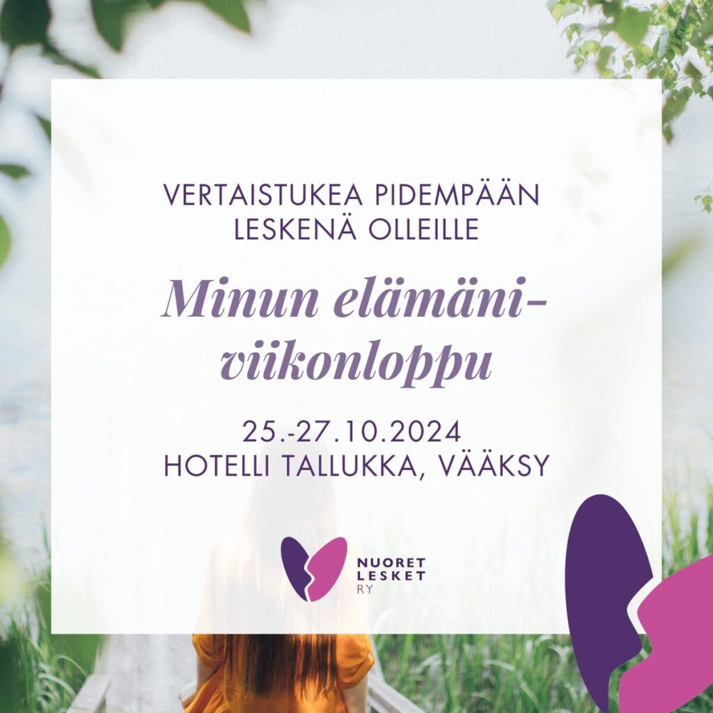Onko leskeytymisestäsi aikaa ja useampi vuosi? Pohditko millaiseen suuntaan haluaisit elämääsi tulevaisuudessa ohjata? Hae mukaan Minun elämäni -viikonloppuun, joka järjestetään 25.-27.10.2024 kylpylähotelli Tallukassa, Vääksyssä (Tallukantie 1, 17200 Vääksy).
