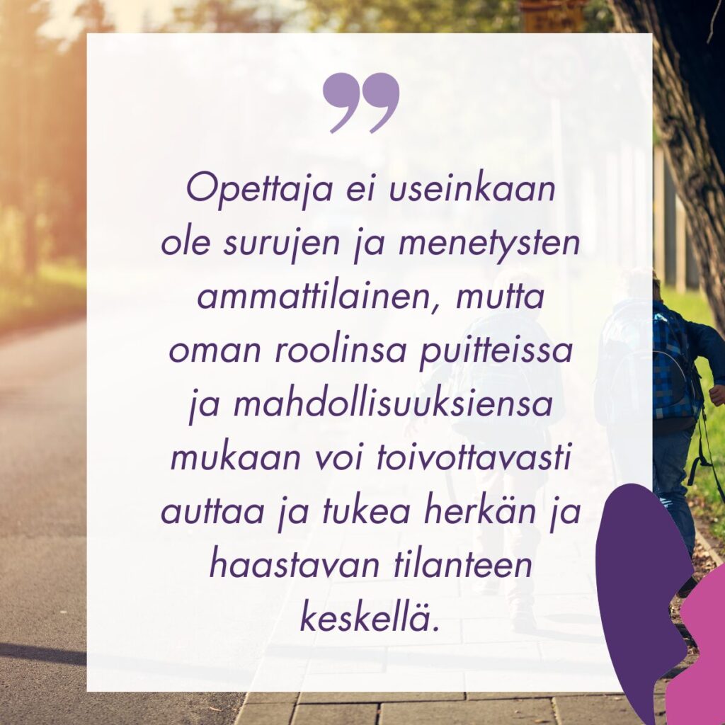 Opettaja ei useinkaan ole surujen ja menetysten ammattilainen, mutta oman roolinsa puitteissa ja mahdollisuuksiensa mukaan voi toivottavasti auttaa ja tukea herkän ja haastavan tilanteen keskellä. Ajattelen, että opettajan olisi ennen kaikkea tärkeä huomioida oppilas ja hänen surunsa, osoittaa hänelle, että kuulen ja näen sinut.