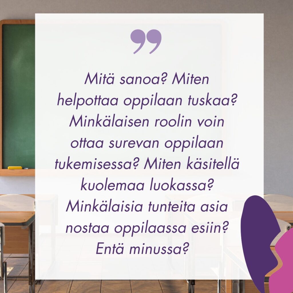 Opettajaa voi huolettaa moni asia surevan oppilaan kohtaamisessa ja kuoleman käsittelyssä. Mitä sanoa? Miten helpottaa oppilaan tuskaa? Minkälaisen roolin voin ottaa surevan oppilaan tukemisessa? Miten käsitellä kuolemaa luokassa? Minkälaisia tunteita asia nostaa oppilaassa esiin? Entä minussa?