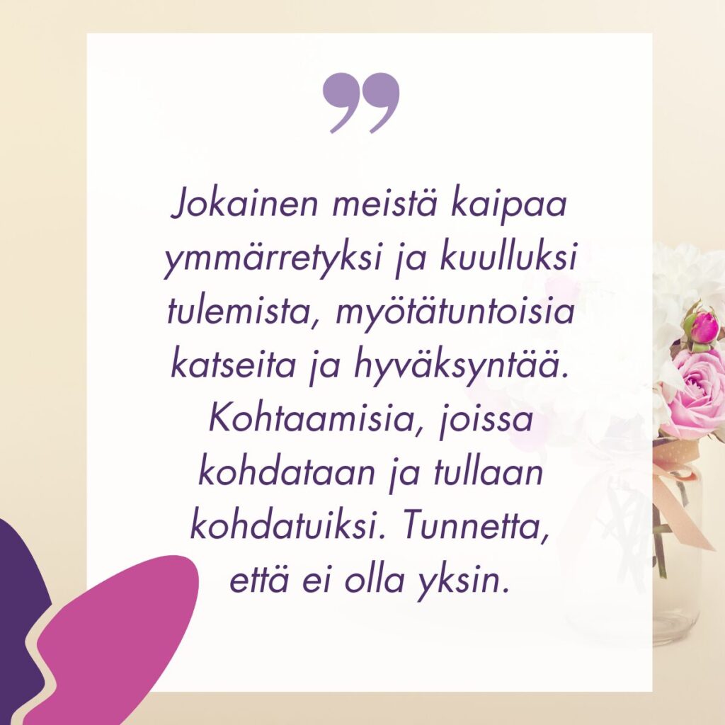 Jokainen meistä kaipaa ymmärretyksi ja kuulluksi tulemista, myötätuntoisia katseita ja hyväksyntää. Kohtaamisia, joissa kohdataan ja tullaan kohdatuiksi. Tunnetta, että ei olla yksin. Silloin kun on vaikeaa, maailma on romahtanut ja kaikki ympäriltä sortunut, tarvitaan lohtua ja turvaa. Tarvitaan uskoa siihen, että vielä joku päivä voi olla helpompaa ja elämä voi tuntua edes hieman kevyemmältä.