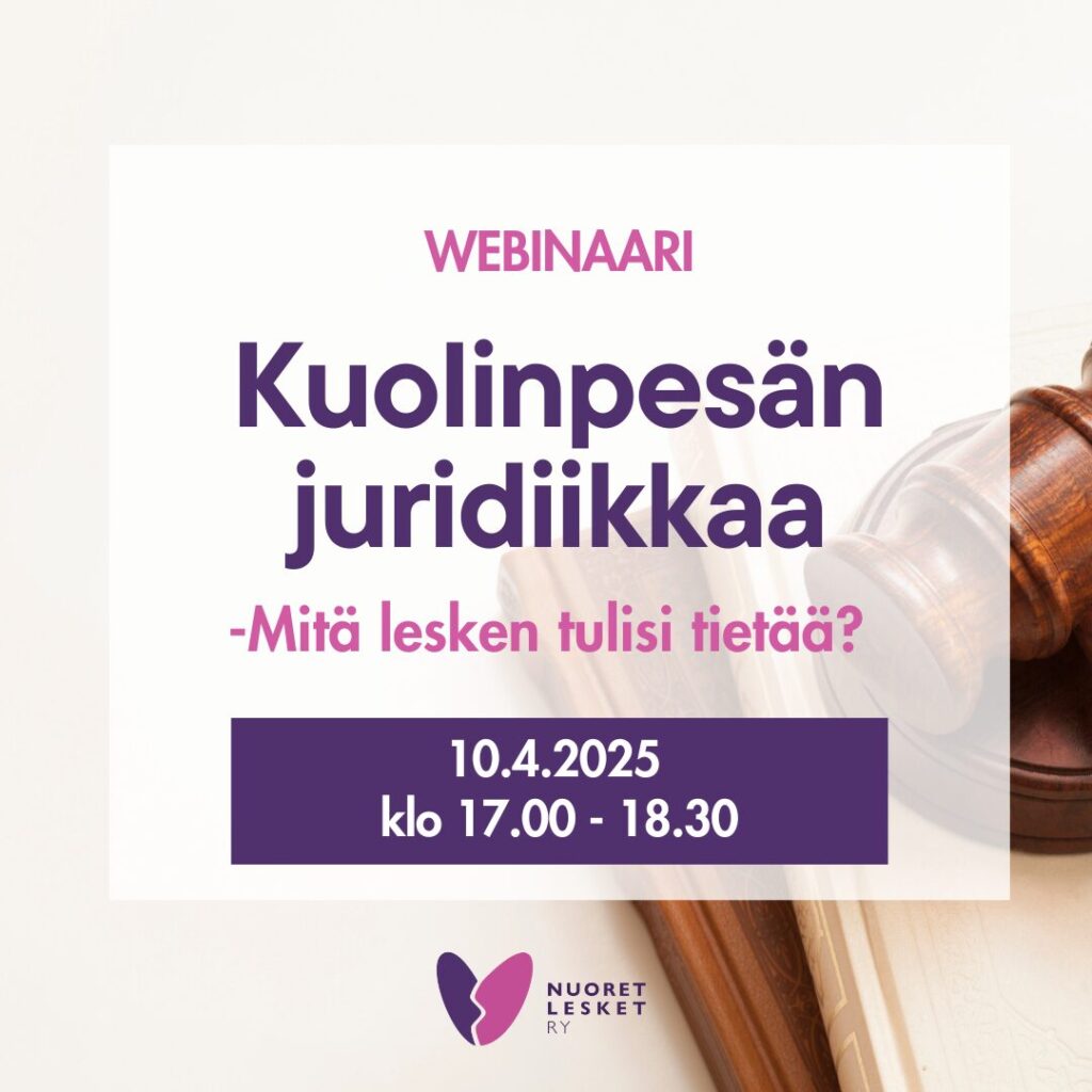 Tervetuloa osallistumaan Kuolinpesän juridiikkaa -webinaariin torstaina 10.4.2025 kello 17.00 – 18.30. Webinaari on maksuton ja sinne ovat tervetulleita kaikki työikäisenä leskeytyneet.