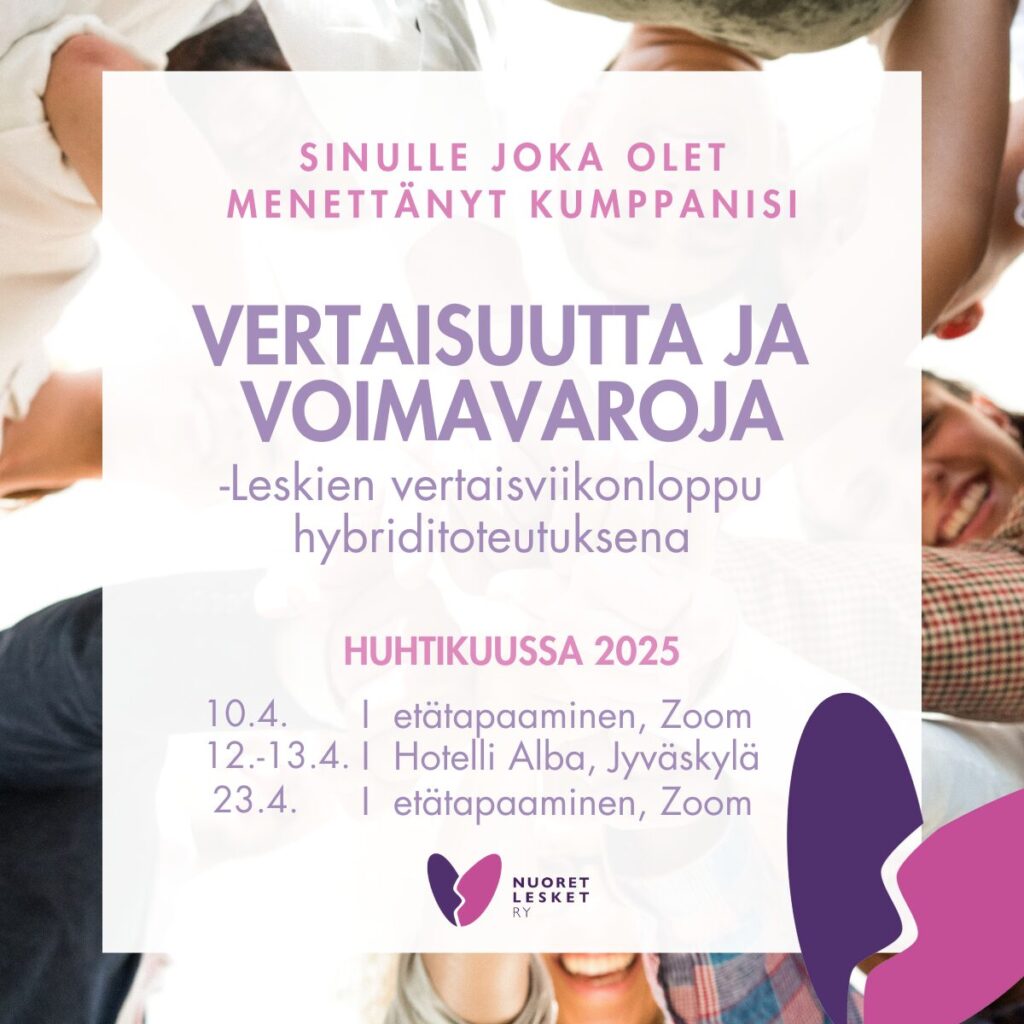 Haku huhtikuussa järjestettävään Vertaisuutta ja voimavaroja – leskien vertaisviikonloppuun on avautunut. Viikonloppu järjestetään hybriditoteutuksena ja se koostuu kolmesta tapaamisesta: lauantaista sunnuntaihin kestävästä lähiviikonlopusta 12.-13.4.2025 Jyväskylässä, hotelli Albassa (Ahlmaninkatu 4, 40100 Jyväskylä) sekä kahdesta Zoomin kautta toteutettavasta etätapaamisesta ennen ja jälkeen viikonlopun (to 10.4. ja ke 23.4.)