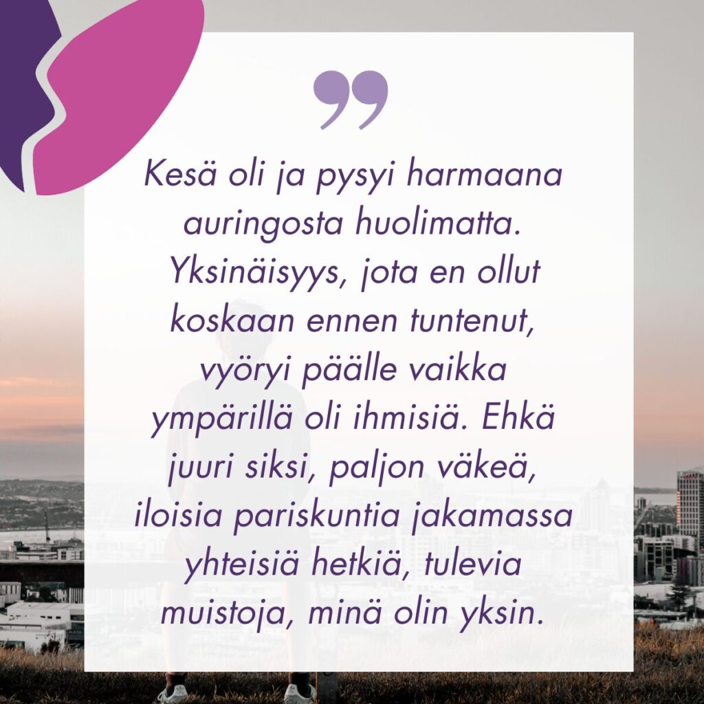 Kesä oli ja pysyi harmaana auringosta huolimatta. Yksinäisyys, jota en ollut koskaan ennen tuntenut, vyöryi päälle vaikka ympärillä oli ihmisiä. Ehkä juuri siksi, paljon väkeä, iloisia pariskuntia jakamassa yhteisiä hetkiä, tulevia muistoja, minä olin yksin. Paikoissa, joissa yhdessä käytiin, en voinut iloita kuten ennen, oli puolikas olo. Kuin raajapari olisi viety. Kahdellakin pärjää mutta neljällä olisi paljon helpompaa. Ilotonta ja harmaata, en nähnyt värejä.