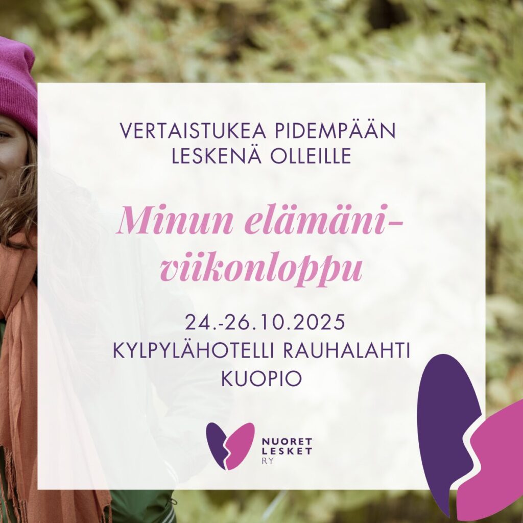 Onko leskeytymisestäsi aikaa ja useampi vuosi? Pohditko millaiseen suuntaan haluaisit elämääsi tulevaisuudessa ohjata? Hae mukaan Minun elämäni -viikonloppuun, joka järjestetään 24.-26.10.2025, Kylpylähotelli Rauhalahdessa Kuopiossa (Katiskaniementie 8, 70700 Kuopio).