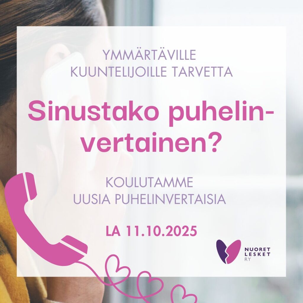 Koulutamme jälleen uusia puhelinvertaisia! Maksuton koulutus järjestetään Zoom-etätapaamisena lauantaina 11.10.2025 klo 10-16. Koulutuspäivä järjestetään yhdessä Surunauha ry:n ja Huoma ry:n kanssa. Kouluttajana toimii Surunauha ry:n vapaaehtoistoiminnan koordinaattori Teppo Kupias. Lisäksi päivän loppupuolella kullakin Surujärjestöllä on oma osionsa, jossa käydään läpi yhdistyskohtaisia toimintaperiaatteita. Nuorten Leskien puolesta mukana on vapaaehtoistoiminnan koordinaattori Emilia Riikonen.