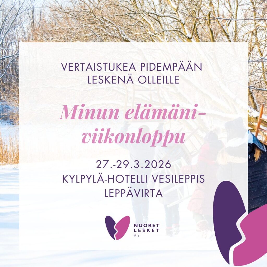 Onko leskeytymisestäsi aikaa ja useampi vuosi? Pohditko millaiseen suuntaan haluaisit elämääsi tulevaisuudessa ohjata? Hae mukaan Minun elämäni -viikonloppuun, joka järjestetään 27.-29.3.2026, kylpylähotelli Vesileppiksessä, Leppävirralla.