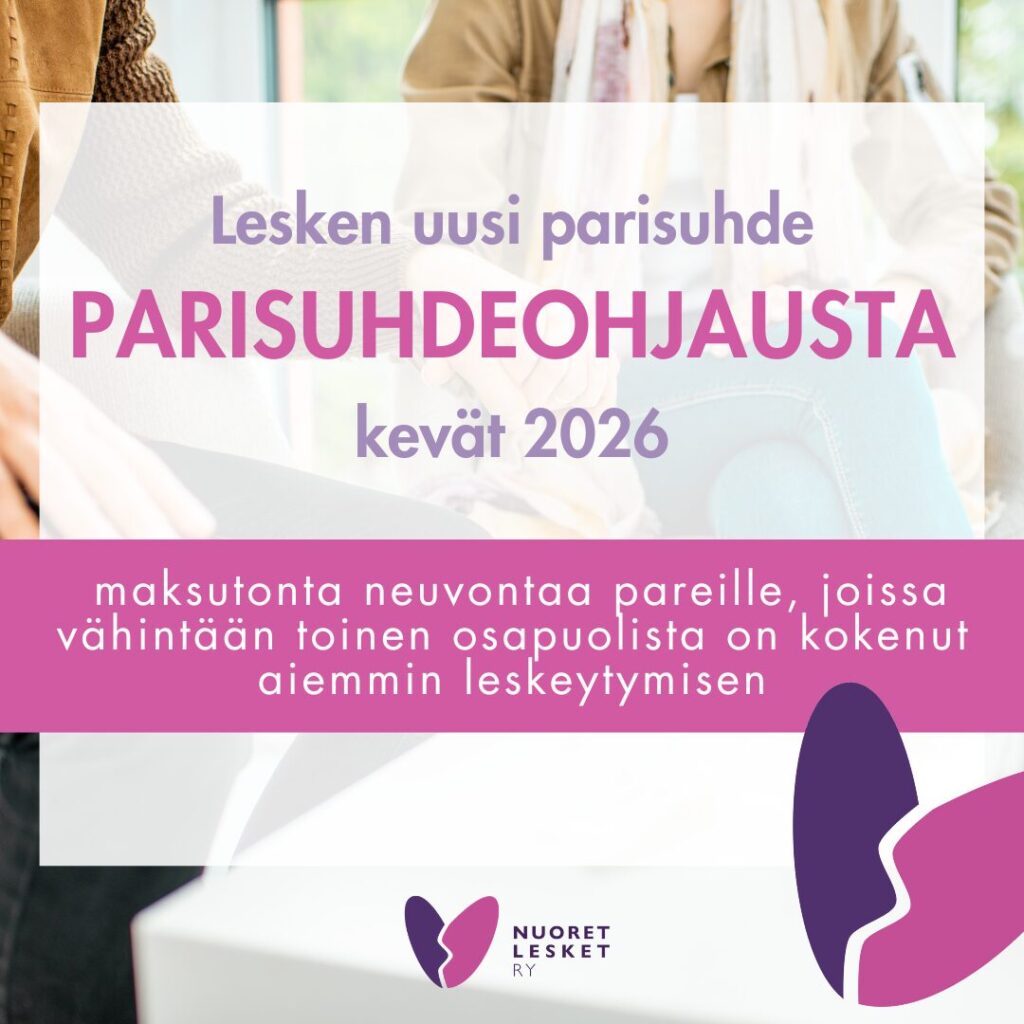 Nuoret Lesket ry tarjoaa keväällä 2026 maksutonta parisuhdeohjausta pareille, joissa toinen tai molemmat ovat kokeneet leskeytymisen. Ohjaus toteutetaan verkossa, ja paikkoja on rajallisesti.