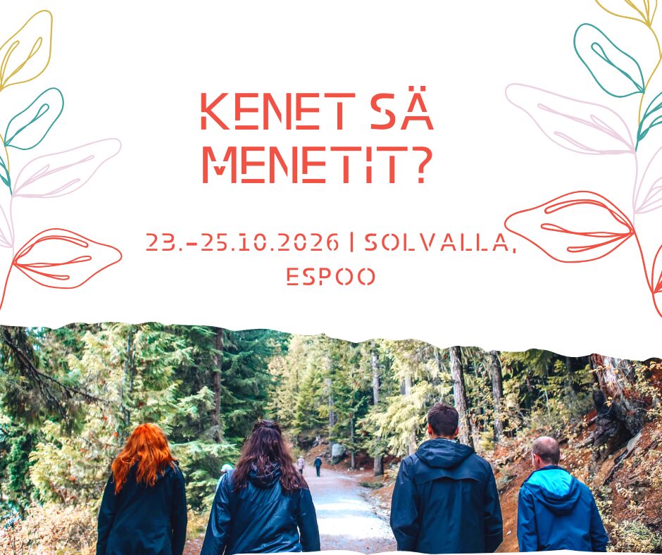 Aika: 23.–25.10.2026, aloitamme perjantai-iltana 23.10. klo 17 mennessä, ohjelma päättyy sunnuntaina 25.10. klo 13 mennessä.