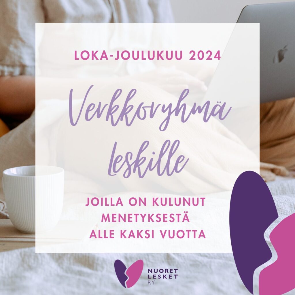 Järjestämme loka-joulukuussa 2024 kuuden kerran pituisen verkkovertaisryhmän työikäisille leskille, joilla leskeytymisestä on aikaa korkeintaan kaksi vuotta. Ryhmä on suljettu eli osallistujat ovat joka kerralla samoja, ryhmän käynnistyttyä mukaan ei oteta uusia osallistujia. Verkkovertaisryhmään osallistuminen tapahtuu Zoom-videoyhteyden kautta. Ryhmään osallistuminen on maksutonta. OSALLISTUMINEN Ryhmä kokoontuu etänä Zoomissa. Osallistumiseen tarvitset tietokoneen, tabletin tai puhelimen, rauhallisen tilan ja nettiyhteyden. […]
